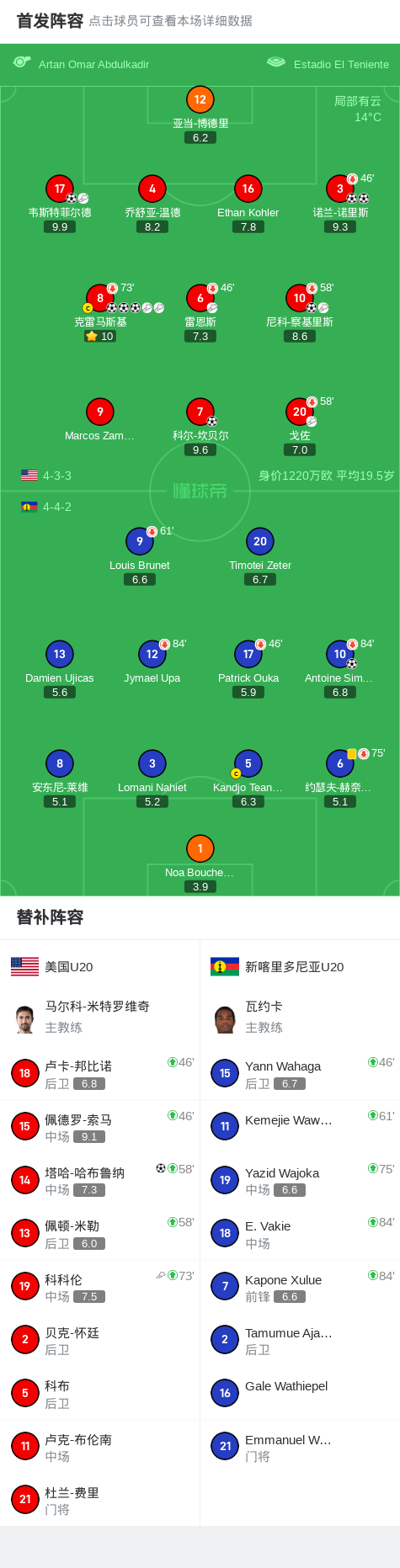 第73分钟,美国U20球员科科伦助攻科尔-坎贝尔打入一球。