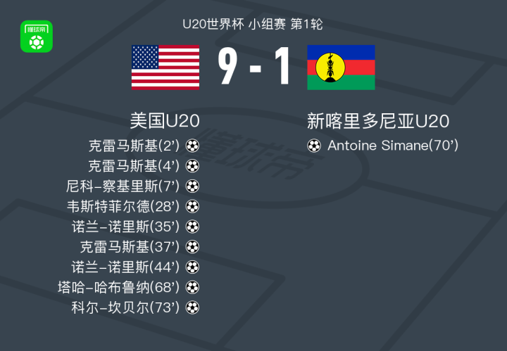 北京时间9月30日U20世界杯 小组赛 第1轮,美国U20对阵新喀里多尼亚U20。美国U20克雷马斯基帽子戏法,尼科-察基里斯破门,韦斯特菲尔德破门,诺兰-诺里斯梅开二度,塔哈-哈布鲁纳破门,科尔-坎贝尔破门。新喀里多尼亚U20Antoine Simane破门。最终比分美国U20 9-1 新喀里多尼亚U20。