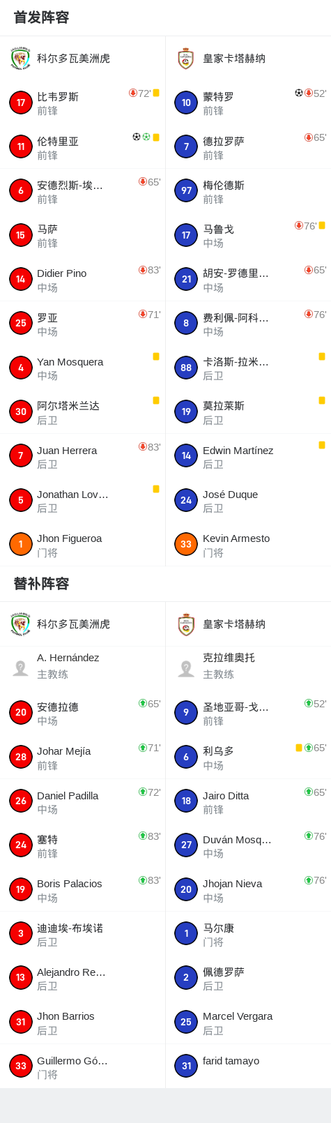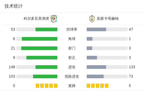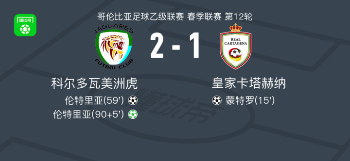 科尔多瓦美洲虎2-1逆转皇家卡塔赫纳取哥伦乙9连胜,伦特里亚包办2球
