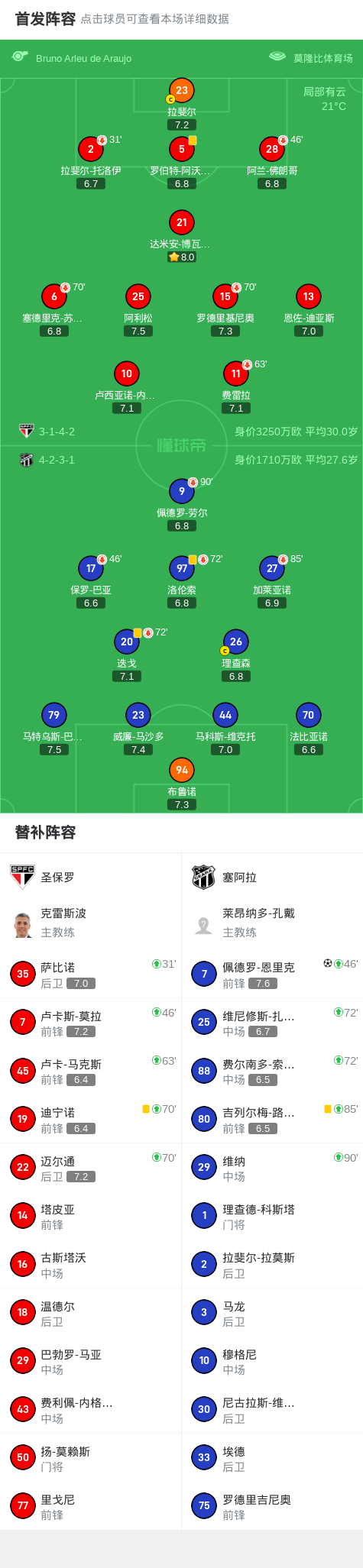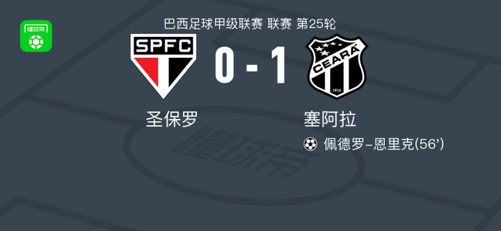 塞阿拉1-0圣保罗,佩德罗-恩里克助球队取胜战报bot @懂球帝2025-09-30 08:59北京时间9月30日,巴西足球甲级联赛第25轮,圣保罗主场迎战塞阿拉。比赛中,塞阿拉球员佩德罗-恩里克攻入全场唯一进球,帮助球队取得领先。最终,塞阿拉以1比0客场战胜圣保罗。点击查看本场比赛详细数据>>点击查看巴甲完整积分榜>>精彩瞬间第56分钟,塞阿拉球员佩德罗-恩里克打入一球。 球队阵容 技术统计 展开更多