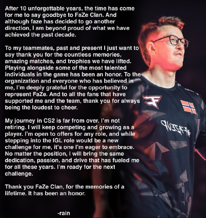 FaZe官方社媒写道:“在CS战队效力3541天后,我们做出了一个非常艰难的决定——将rain调整到替补席。Håvard依然是一位世界级选手,他的职业生涯远没有结束。我们非常感谢他为我们带来的美好回忆,你永远是FaZe大家庭的传奇人物!❤️”