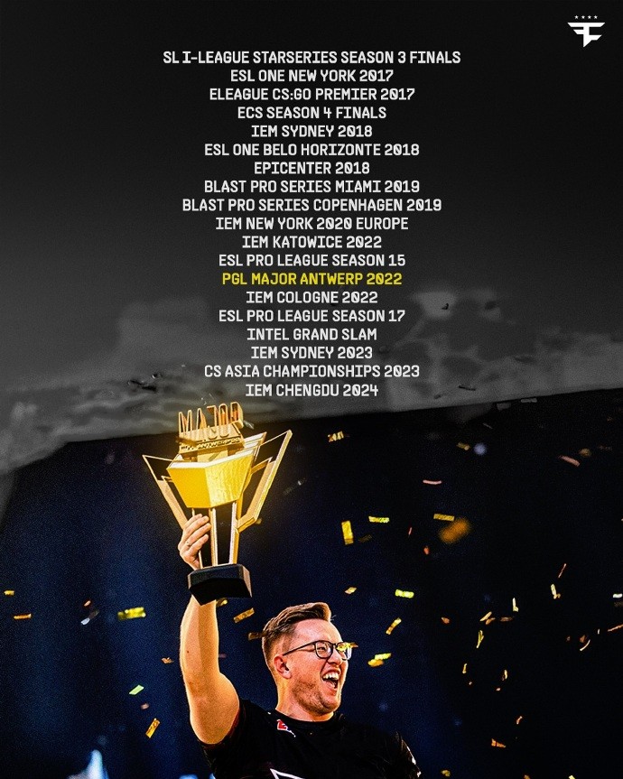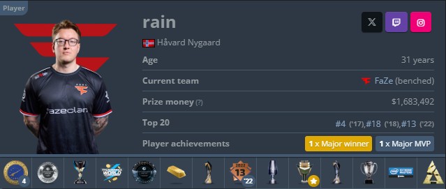 效力FaZe的十年内,雨神帮助队伍拿到了近20座大赛冠军并完成大满贯成就,在最关键的2022年安特卫普Major中,rain打出无解的个人表现荣膺赛事MVP。
