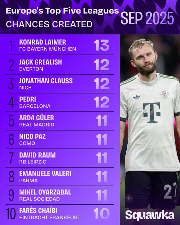 五大联赛9月创造机会榜:莱默尔第1,格10、佩德里紧随其后