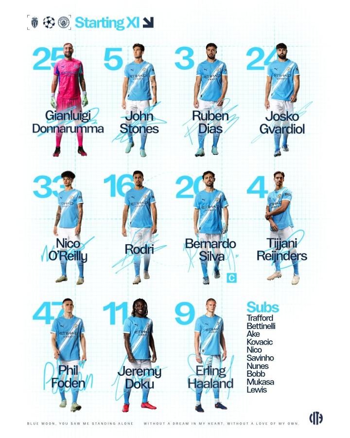 曼城客战摩纳哥:哈兰德领衔,多库、福登、赖因德斯出战