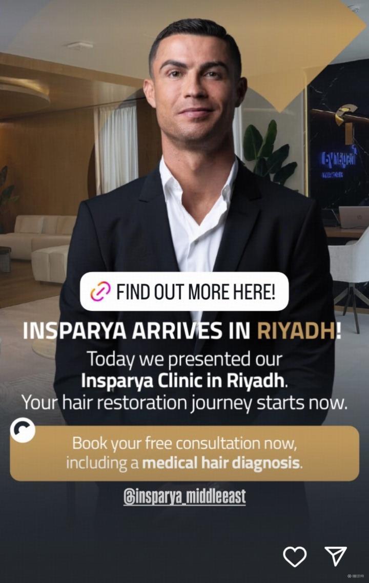 10月2日,C罗在社交媒体宣布,其旗下的Insparya植发诊所将在利雅得开业。C罗作为Insparya集团的联合创始人,也在社交媒体为个人的品牌做了宣传。
