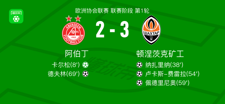 北京时间10月3日欧洲协会联赛 联赛阶段 第1轮,阿伯丁对阵顿涅茨克矿工。阿伯丁卡尔松破门,德夫林破门。顿涅茨克矿工纳扎里纳破门,卢卡斯-费雷拉破门,佩德里尼奥破门。最终比分阿伯丁 2-3 顿涅茨克矿工。