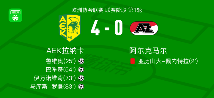北京时间10月3日,欧洲协会联赛联赛阶段第1轮,AEK拉纳卡迎战阿尔克马尔。比赛伊始,阿尔克马尔球员亚历山大-佩内特拉被红牌罚下,球队早早陷入被动。随后,AEK拉纳卡抓住机会展开攻势,鲁维奥率先破门,为球队取得领先。此后,古斯-莱德斯送出助攻,巴季奇接球后冷静施射建功。下半场,查孔在边路策动进攻,精准传球帮助伊万诺维奇再下一城。比赛尾声阶段,米利切维奇送出妙传,马库斯-罗登推射得手,将比分锁定。最终,AEK拉纳卡以4比0战胜对手。