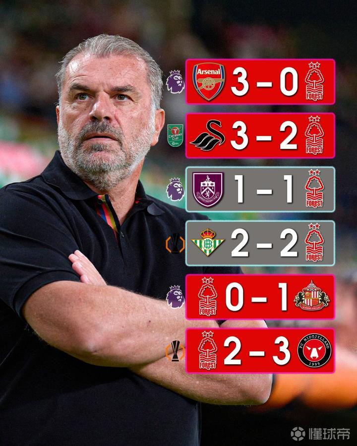 自北京时间9月9日,诺丁汉森林官方宣布前热刺主教练波斯特科格鲁成为一线队新主帅以来,波斯特科格鲁已带队出战英超、英联杯以及欧联杯各项赛事中的6场比赛,取得2平4负的战绩,至今未尝一胜。