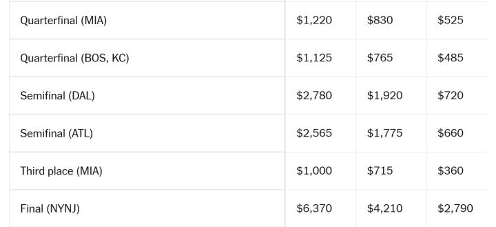 除美国男足比赛外,美国赛区小组赛票价如下(南加州SoFi体育场、湾区李维斯体育场和新泽西大都会人寿体育场票价较高):