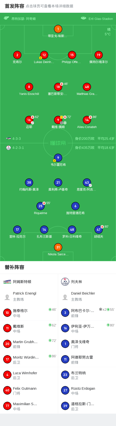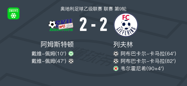 北京时间10月4日奥地利足球乙级联赛 联赛 第9轮,阿姆斯特顿主场对阵列夫林。阿姆斯特顿戴维-佩姆梅开二度。列夫林阿布巴卡尔-卡马拉梅开二度。最终比分阿姆斯特顿 2-2 列夫林。