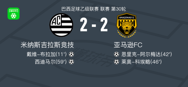 北京时间10月4日巴西足球乙级联赛 联赛 第30轮,米纳斯吉拉斯竞技主场对阵亚马逊FC。米纳斯吉拉斯竞技戴维-布拉加破门,西迪马尔破门。亚马逊FC恩里克-阿尔梅达破门,莱奥-科埃略破门。最终比分米纳斯吉拉斯竞技 2-2 亚马逊FC。