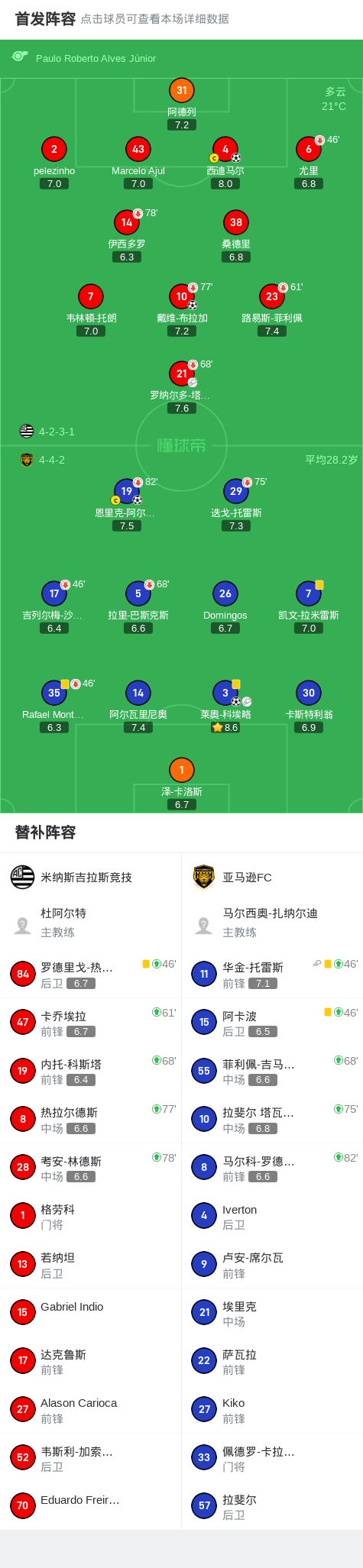 米纳斯吉拉斯竞技2-2亚马逊FC,戴维-布拉加破门,西迪马尔救主
