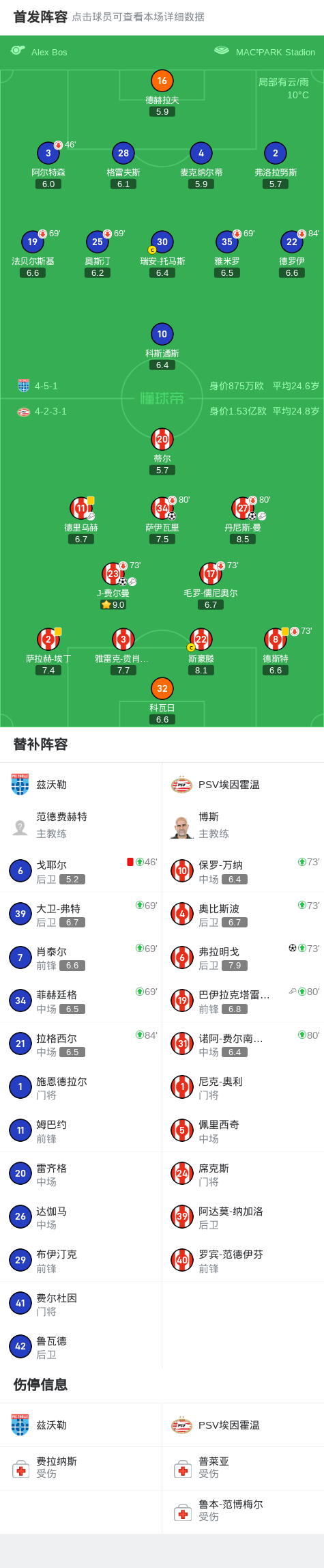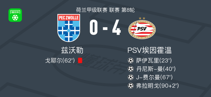 PSV埃因霍温4-0大胜兹沃勒,弗拉明戈破门,J-费尔曼传射