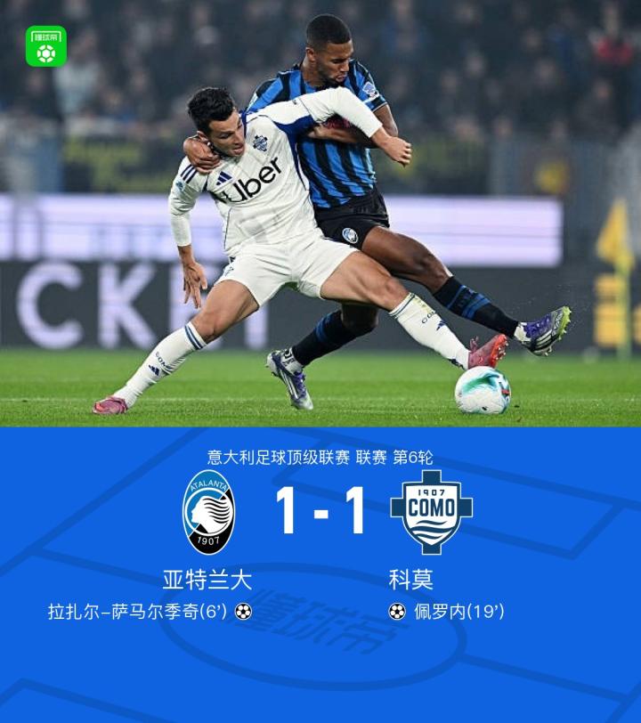 北京时间10月5日,意大利足球顶级联赛第6轮展开角逐,亚特兰大坐镇主场迎战科莫。比赛开始后,亚特兰大率先打破僵局,拉扎尔-萨马尔季奇接队友配合后果断起脚,将球送入对方网窝,为主队取得领先。随后科莫迅速做出回应,佩罗内在进攻中抓住机会完成破门,帮助客队扳平比分。此后双方互有攻守,但均未能再度改写比分。最终全场战罢,亚特兰大与科莫以1比1握手言和。