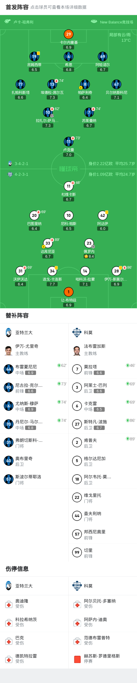 亚特兰大1-1战平科莫,萨马尔季奇破门,佩罗内扳平