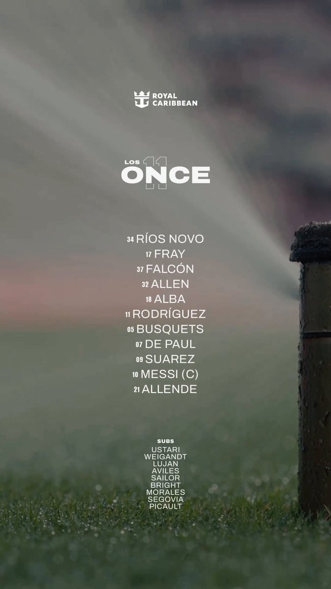 迈阿密国际首发:5-布斯克茨、7-德保罗、9-苏亚雷斯、10-梅西、11-巴尔塔萨尔-罗德里格斯、17-伊恩-弗雷、18-阿尔巴、21-阿连德、32-诺亚-艾伦、34-里奥斯、37-法尔孔