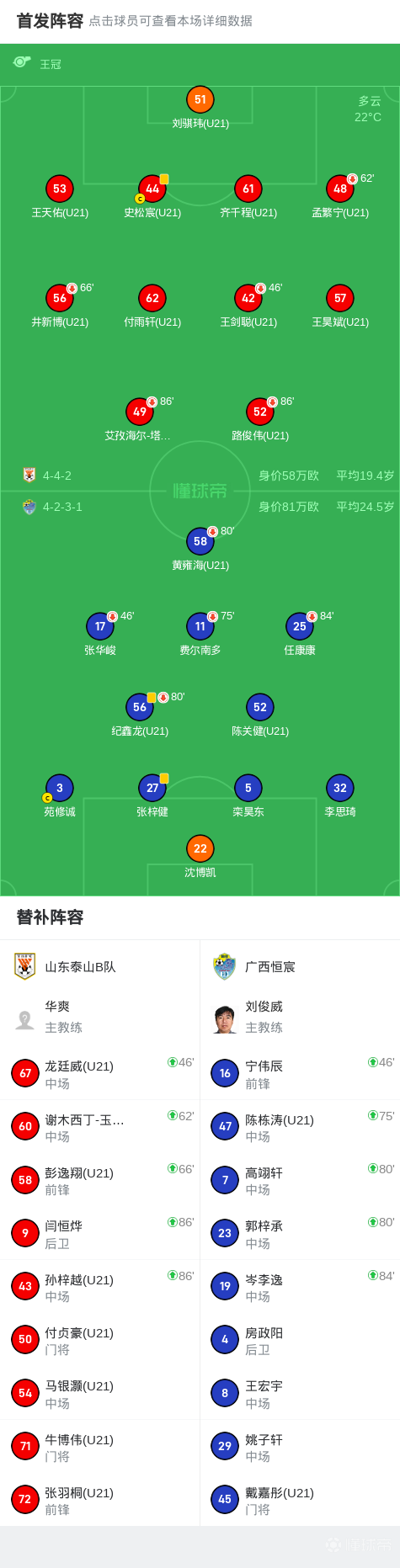 山东泰山B队0-0广西恒宸,纪鑫龙错失良机,艾孜海尔造险
