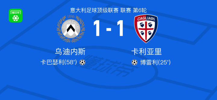 乌迪内斯1-1卡利亚里,博雷利破僵,卡巴瑟利扳平比分
