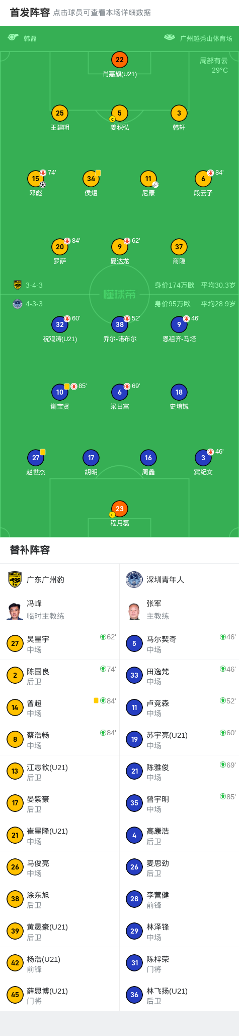 第35分钟,邓彪禁区争顶角球头球破门,广东广州豹1-0深圳青年人
