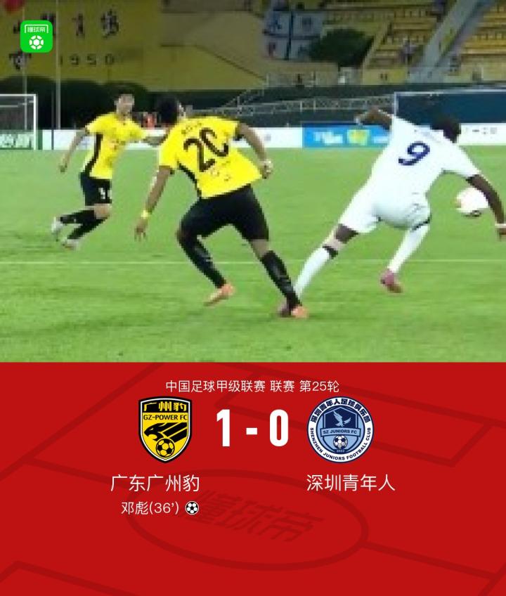 广东广州豹1-0深圳青年人,邓彪一锤定音