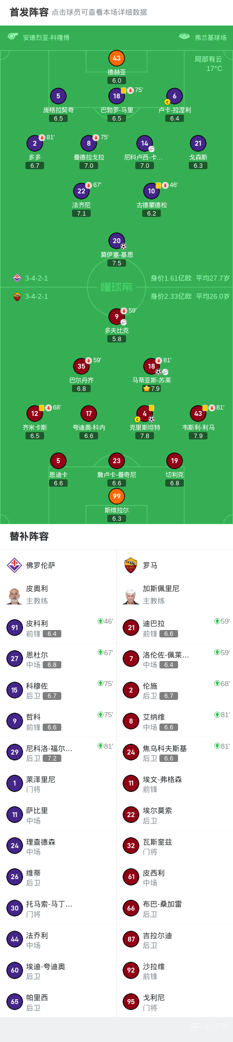 第23分钟,苏莱禁区外远射破门,罗马1-1佛罗伦萨