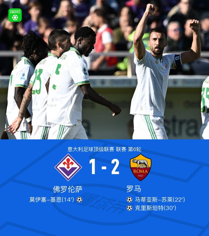 北京时间10月5日,2025-2026赛季意大利足球甲级联赛第6轮,佛罗伦萨坐镇主场迎战罗马。比赛中,佛罗伦萨率先取得进球,尼科卢西-卡维利亚送出助攻,莫伊塞-基恩破门得分。随后罗马迅速做出回应,多夫比克助攻马蒂亚斯-苏莱攻破对手球门,将比分扳平。紧接着,马蒂亚斯-苏莱策动进攻并精准传球,帮助克里斯坦特推射入网,完成反超。最终全场比赛结束,佛罗伦萨以1-2不敌罗马。
