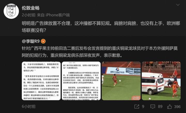 而在事件发生后,经纪人金畅在社交媒体上表达了对此事的看法。他写道:“明明是广告牌放置不合理,这冲撞都不算犯规。肩膀对肩膀,也没有上手,欧洲哪场联赛没有?”