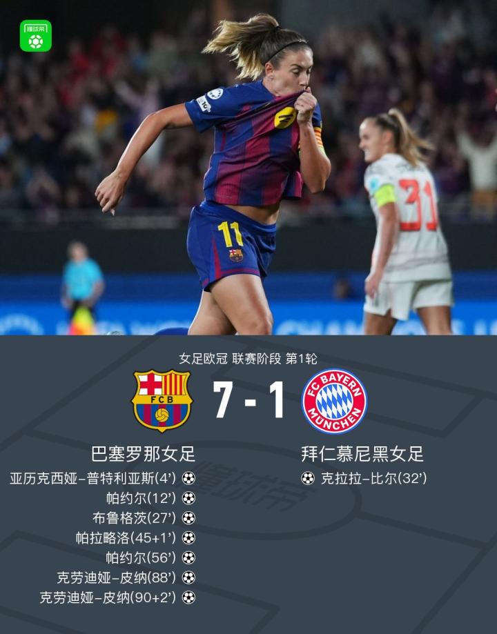 北京时间10月8日女足欧冠 联赛阶段 第1轮,巴塞罗那女足对阵拜仁慕尼黑女足。巴塞罗那女足亚历克西娅-普特利亚斯破门,帕约尔梅开二度,布鲁格茨破门,帕拉略洛破门,克劳迪娅-皮纳梅开二度。拜仁慕尼黑女足克拉拉-比尔破门。最终比分巴塞罗那女足 7-1 拜仁慕尼黑女足。