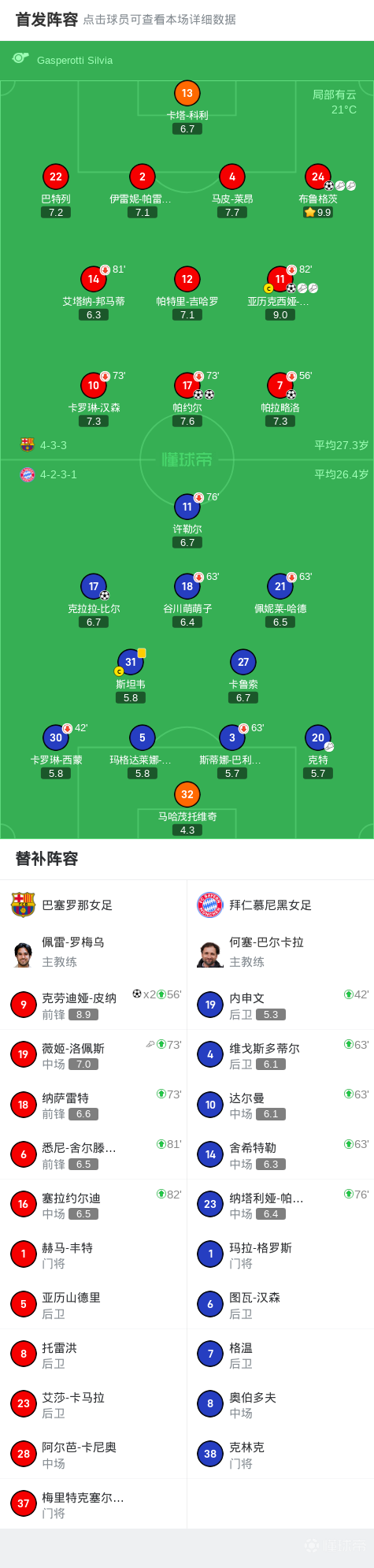 巴萨女足7-1狂胜拜仁女足,克劳迪娅-皮纳、帕约尔均梅开二度