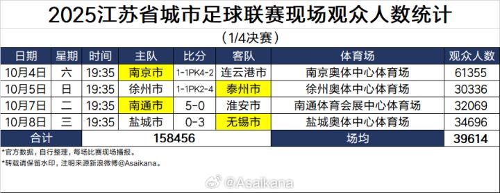 双节期间看球,苏超四场1/4决赛超15万人现场观战ETChalmers @懂球帝2025-10-08 21:50据德转亚洲区管理员朱艺@Asaikana 的消息,苏超1/4决赛4场比赛超15万人现场观战。2025江苏省城市足球联赛现场观众人数统计(1/4决赛) “苏超”本轮起进入淘汰赛阶段,正值国庆中秋双节假期,四场1/4决赛共吸引了158456名观众现场观战,场均39614人。南京奥体中心人数达61355人,再创纪录。 展开更多