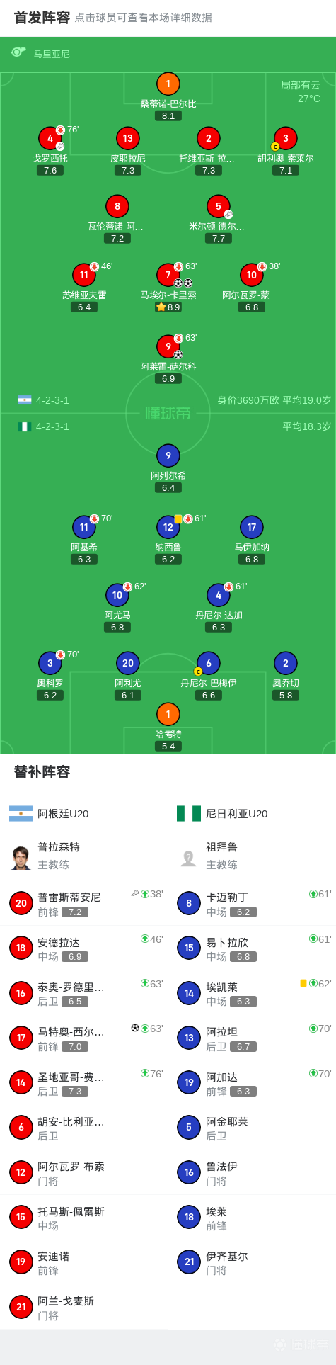 第23分钟,阿根廷U20球员马埃尔-卡里索打入一球。