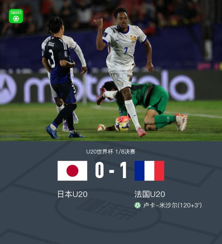 在U20世界杯1/8决赛中,日本U20与法国U20展开激烈对决。比赛进入加时赛下半场补时阶段,法国U20球员卢卡-米沙尔主罚点球命中,攻入全场唯一进球。最终,日本U20以0-1不敌法国U20,法国U20成功晋级下一轮。