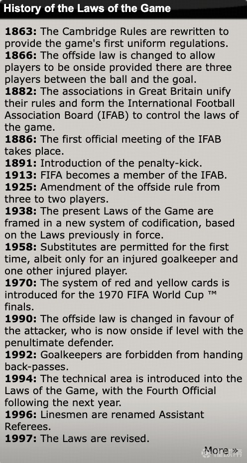 1863年,第一部足球通用规则在伦敦制定。1886年6月2日,为维护足球规则的统一,解决各协会间足球规则的冲突,国际足球协会理事会(IFAB)正式成立。