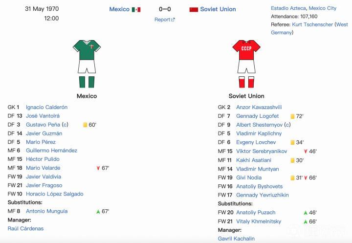 1970年世界杯诞生了两项伟大革新,换人与红黄牌首次出现。当届世界杯揭幕战,前苏联球员普扎赫成为世界杯史上第一位被换上的球员,当时的换人规则允许每支球队更换两名球员。