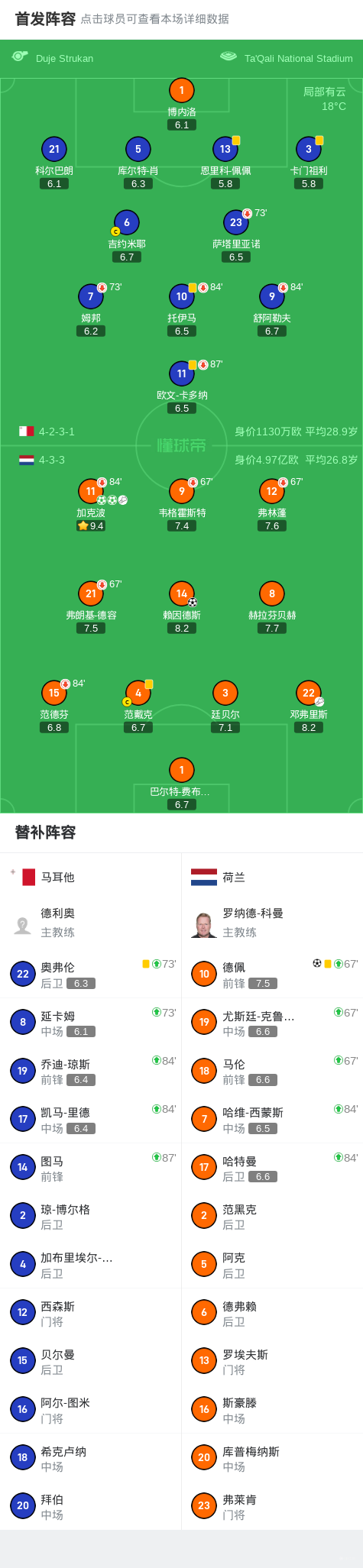 荷兰4-0马耳他,加克波2射1传+进球被吹,赖因德斯、德佩破门