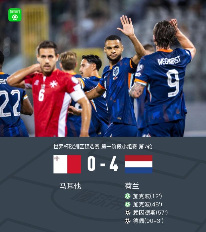 北京时间10月10日,世界杯欧洲区预选赛第一阶段小组赛第7轮,马耳他对阵荷兰。上半场,韦格霍斯特进球被吹,赫拉芬贝赫造点后加克波主罚命中;下半场,韦格霍斯特造点后加克波再次主罚得手上演梅开二度,加克波包抄破门被判越位进球无效,加克波助攻赖因德斯推射入网,邓弗里斯助攻德佩头球破门。最终,全场比分定格为马耳他 0-4 荷兰。
