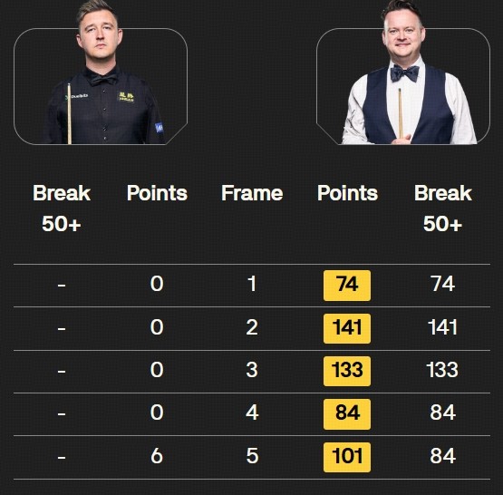 在整场比赛里,墨菲完全掌控了局势,打出了单杆74、141、133、84、84分。墨菲连续得分高达533分,险些打破奥沙利文556分的世界纪录。