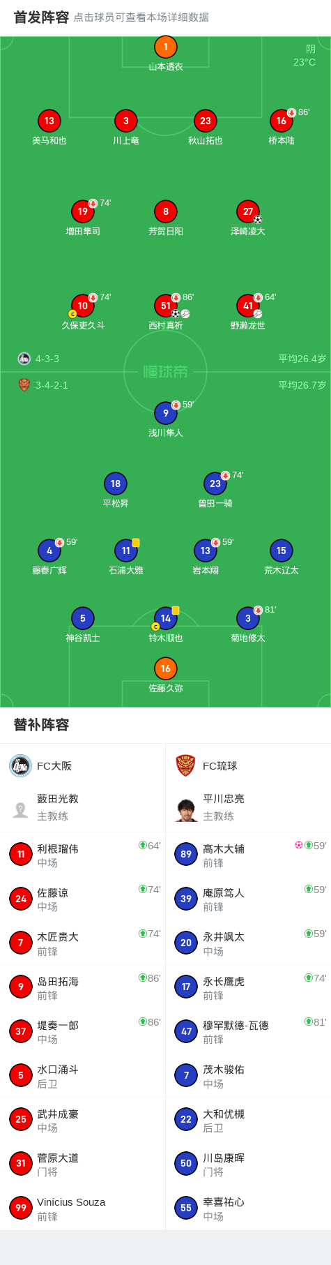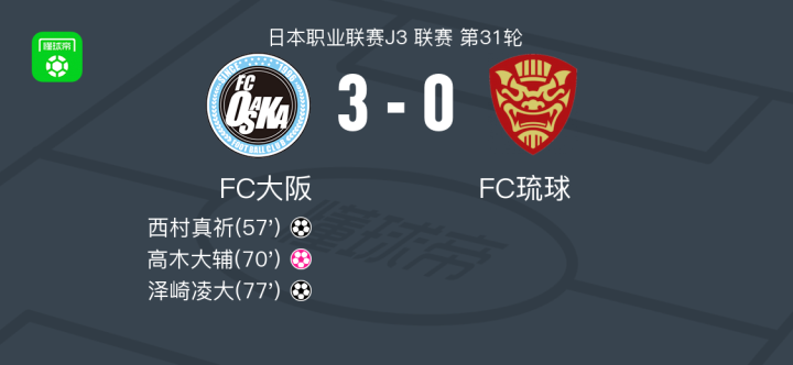 北京时间10月10日日本职业联赛J3 联赛 第31轮,FC大阪主场对阵FC琉球。FC大阪西村真祈破门,泽崎凌大破门。FC琉球高木大辅自摆乌龙。最终比分FC大阪 3-0 FC琉球。