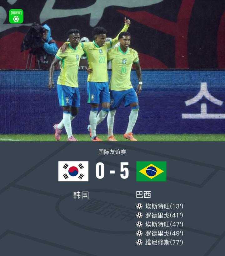北京时间10月10日国际友谊赛,韩国对阵巴西。比赛第13分钟,吉马良斯送出助攻,埃斯特旺破门得分。第41分钟,卡塞米罗助攻罗德里戈建功。上半场结束前,巴西队扩大领先优势。易边再战仅两分钟,埃斯特旺再度建功,完成个人梅开二度。第49分钟,维尼修斯送出精准传球,罗德里戈冷静破门,实现梅开二度。第77分钟,马特乌斯-库尼亚助攻,维尼修斯单骑闯关破门。最终全场比赛结束,韩国0-5巴西。