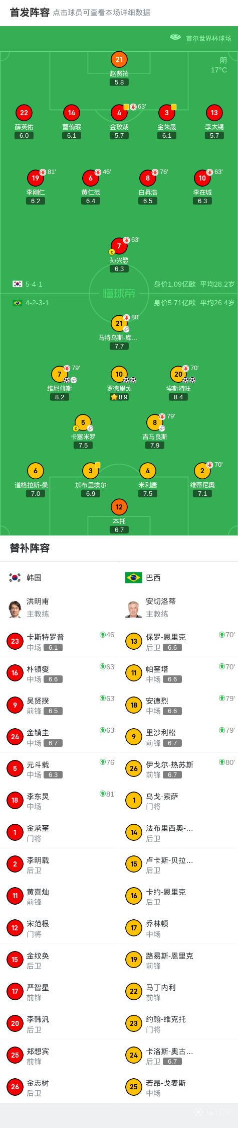第41分钟,罗德里戈晃开防守球员劲射得分,巴西2-0韩国