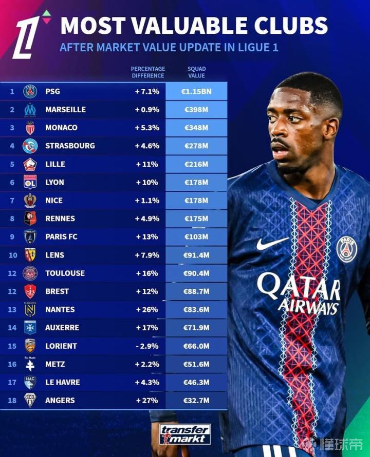 德转列法甲俱乐部身价排名:巴黎超11亿欧断崖领先,马赛第2