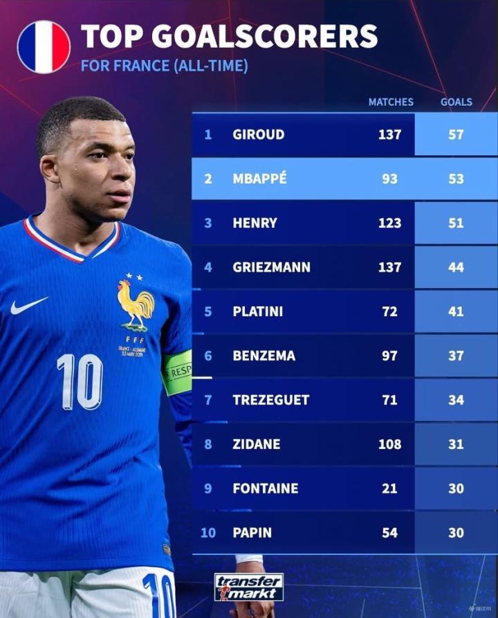法国国家队队史射手榜前10: