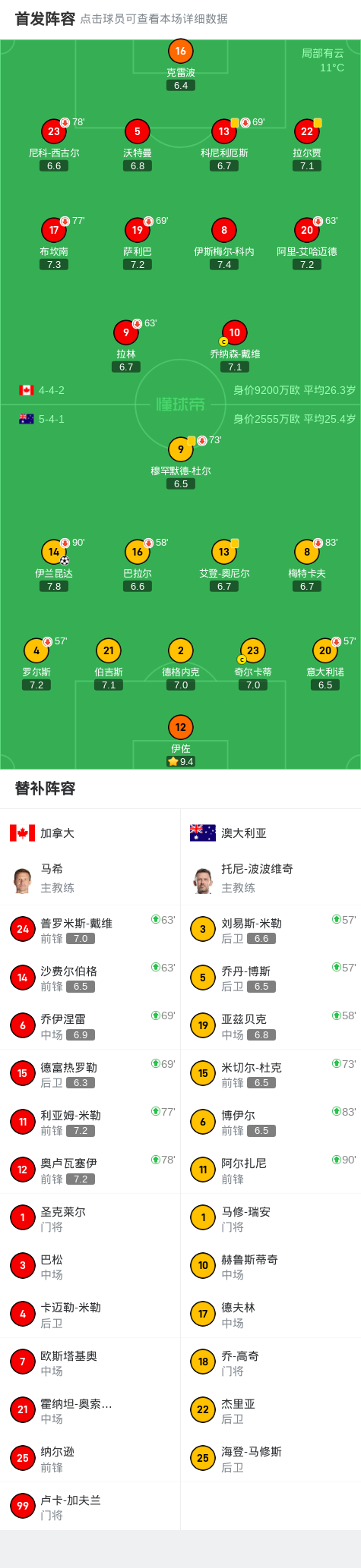 澳大利亚1-0加拿大,伊兰昆达制胜球战报bot @懂球帝2025-10-11 09:36北京时间10月11日国际友谊赛,加拿大与澳大利亚展开较量。比赛中,伊兰昆达攻入全场唯一进球,帮助球队取得领先。最终比分定格为加拿大 0-1 澳大利亚。点击查看本场比赛详细数据>>精彩瞬间第71分钟,澳大利亚球员伊兰昆达打入一球。 球队阵容 技术统计 展开更多