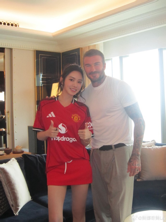 篮球女主播美娜晒与贝克汉姆合影,前者身穿小贝曼联7号球衣