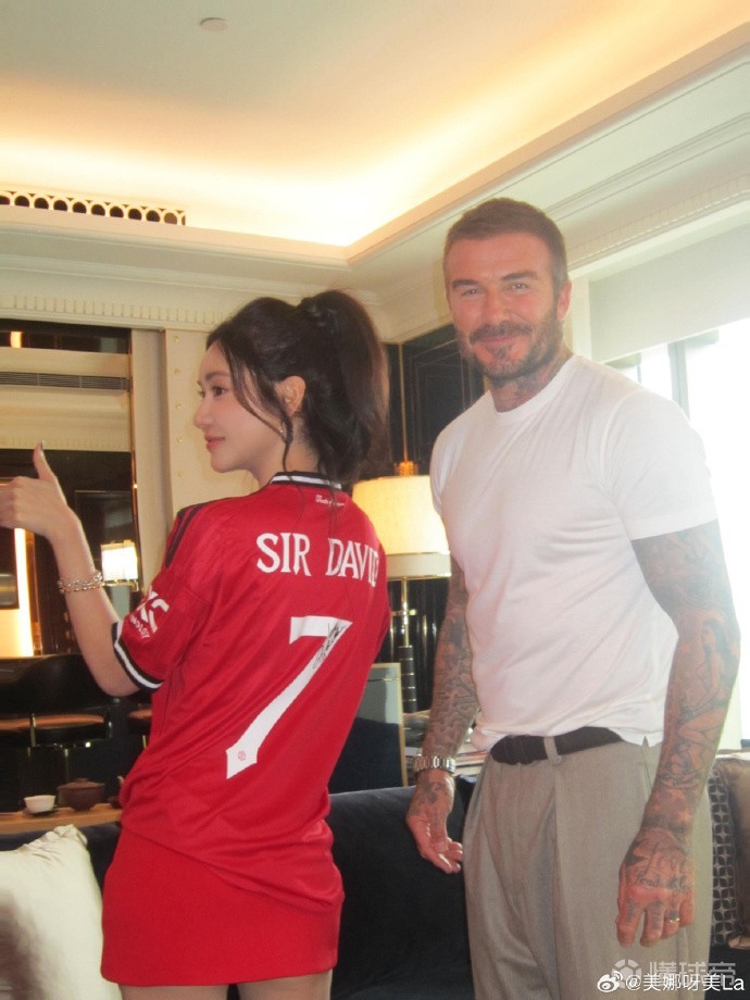 在昨晚的比赛中,贝克汉姆与马云、成龙和蔡崇信一同坐在场边观赛,美娜则是作为腾讯体育的解说嘉宾前往现场。美娜在合影中身着曼联球衣,背后则印着7号和“Sir David”的名字。美娜也为这两张照片配文写道:“Sir David~ !!! ”