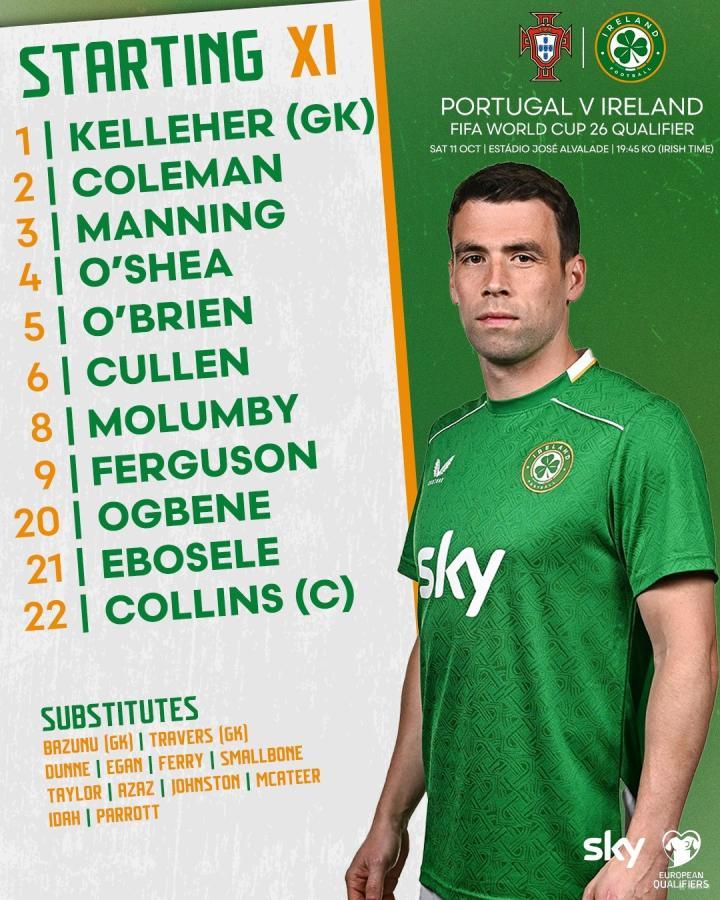 爱尔兰首发:1-凯莱赫、22-内森-科林斯、4-达拉-奥谢、5-奥布赖恩、2-科尔曼、8-莫伦比、6-库伦、21-埃博塞莱、3-曼宁、9-埃文-弗格森、20-奥贝内
