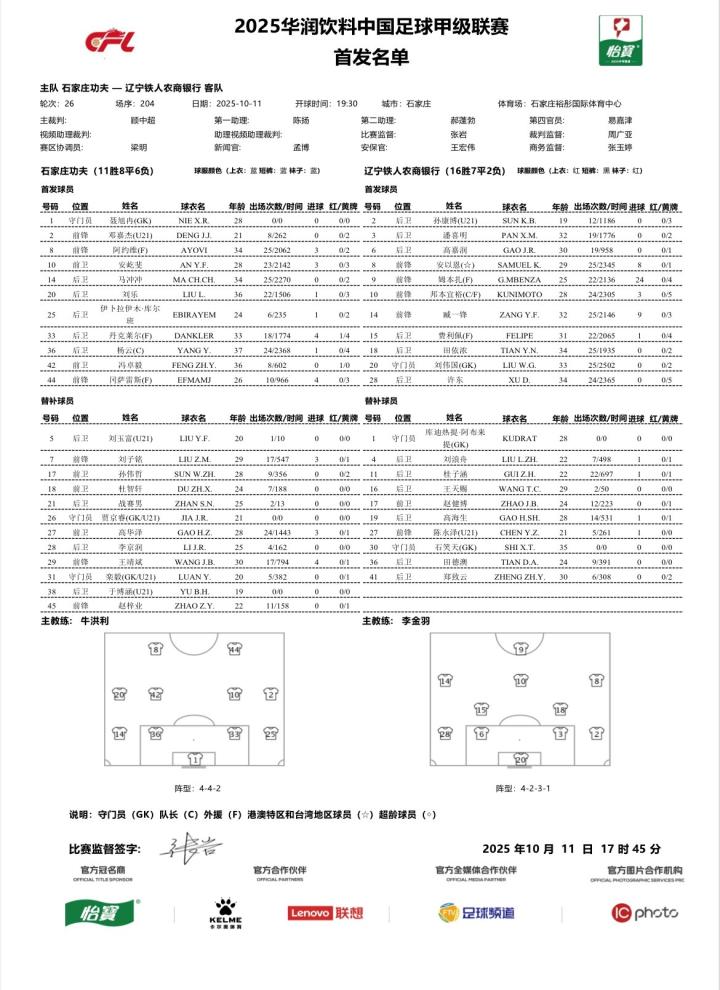 北京时间10月11日19:30,中甲联赛第26轮迎来一场冲超焦点战,领头羊辽宁铁人客场挑战排名第五的石家庄功夫。本场比赛在石家庄裕彤国际体育中心进行,主裁判是顾中超。赛前双方首发阵容公布: