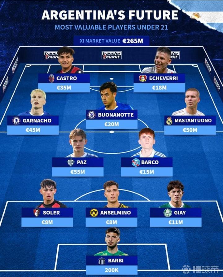 北京时间10月11日,德转列出了阿根廷身价最高的U21球员阵容,尼科-帕斯以5500万欧元的身价领衔,马斯坦托诺、加纳乔、埃切韦里以及法昆多-博纳诺特在列。