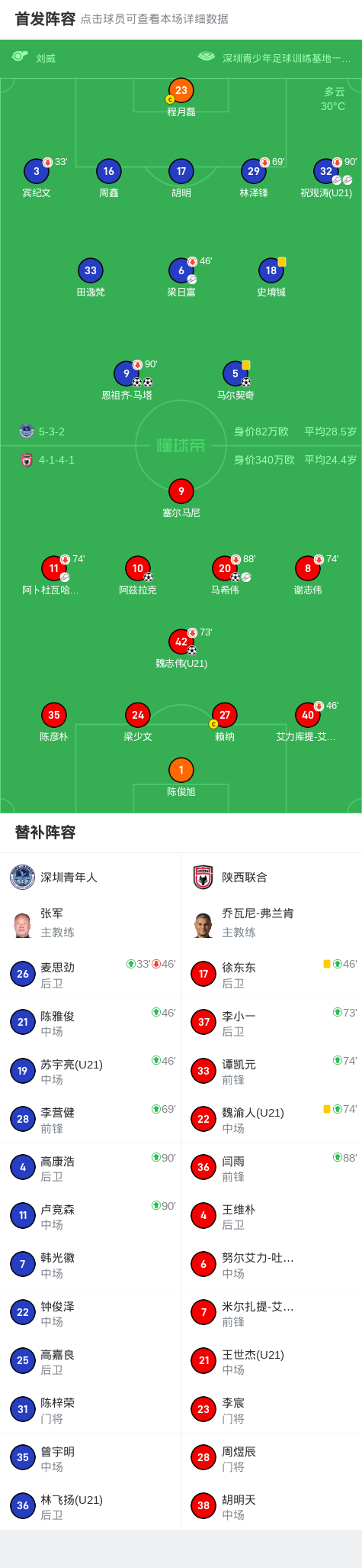 北京时间10月12日中国足球甲级联赛第26轮,深圳青年人主场对阵陕西联合。深圳青年人马尔契奇破门,恩祖齐-马塔梅开二度。陕西联合魏志伟、马希伟建功,阿兹拉克角球直接破门。最终比分深圳青年人3-3陕西联合。