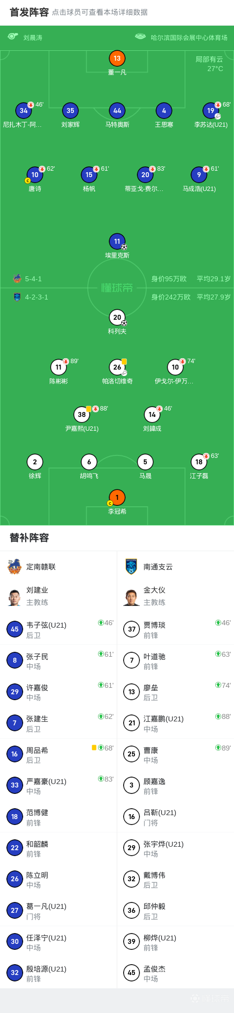 定南赣联1-1南通支云,埃里克斯破门,科列夫头球扳平